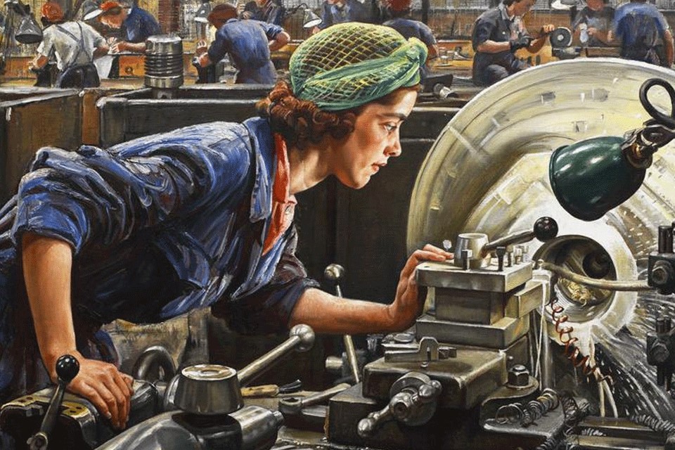 Above: Ruby Loftus, ‘an outstanding factory worker’, screwing a Breech-ring at the Royal Ordinance Factory in Newport. Source. Click to open full-size.