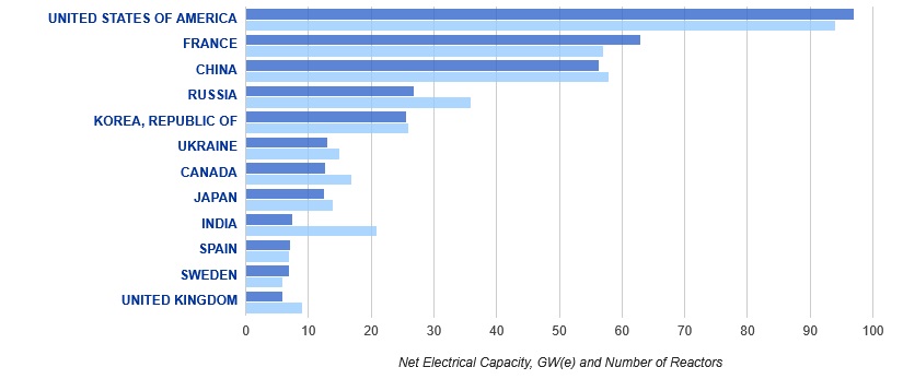 Above: Nuclear reactors and generation capacity for the 12 largest countries. Source. Click to open full-size.