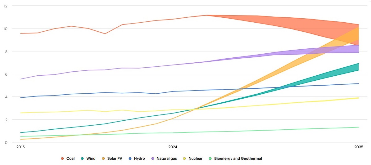 Above: Electricity generation in the Current Policies Scenario and Stated Policies Scenario, 2015-2035. For each source, the two bounds represent the conservative "current policies scenario" and the "stated policies scenario". Source. Click to open full-size.