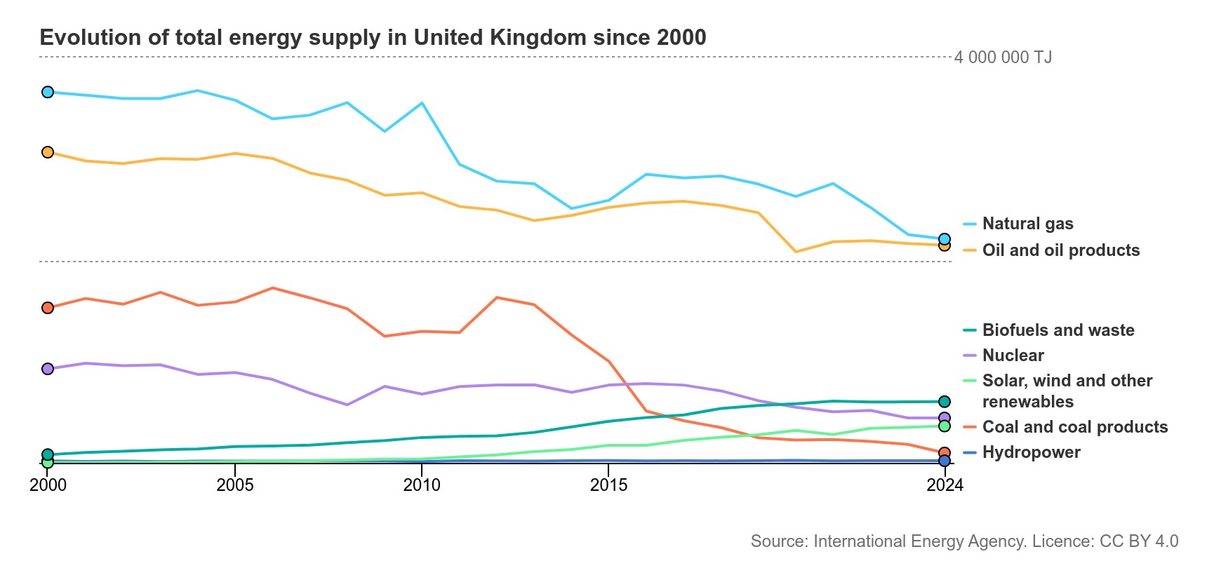 Above: Evolution of total energy supply in United Kingdom since 2000. Please note: "energy" refers to consumption of fuels, not only of electricity. Source. Click to open full-size.